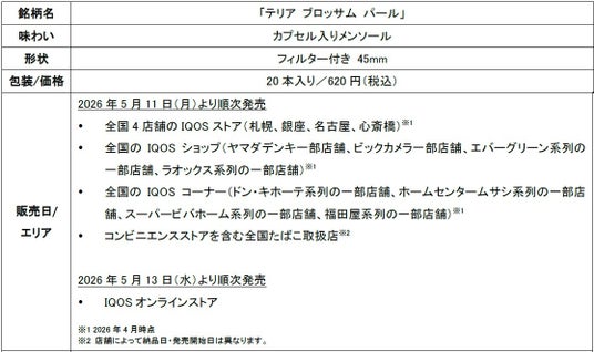 フィリップ モリス ジャパン合同会社(本社:東京都千代田区、社長:シェリー・ゴー、以下「PMJ」)は、加熱式たばこ「IQOS ILUMA(イルマ)」シリーズ専用たばこスティック「TEREA(テリア)」から、「テリア ブロッサム パール」を、2026年5月11日(月)より、全国4店舗のIQOSストア※1、IQOSショップ(ヤマダデンキおよび、ビックカメラ一部店舗他)、IQOSコーナー(ドン・キホーテ系列の一部店舗他)※1、コンビニエンスストアを含む全国のたばこ取扱店※2にて、2026年5月13日(水)より、IQOSオンラインストアにて順次発売いたします。