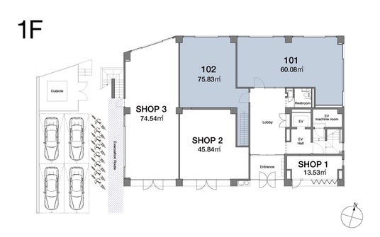1Fならではのスムーズなアプローチと、天井高3.6mのゆとりある空間を活かしたショールーム兼オフィス区画。自社プロダクトの展示や商談、オープンなワークプレイスなど、企業の個性や利用目的に合わせた柔軟な運用に対応します。専用の地下フロアを備えた102区画は、1Fと地下を使い分けることで、撮影スタジオなど多様な用途での活用も可能です。