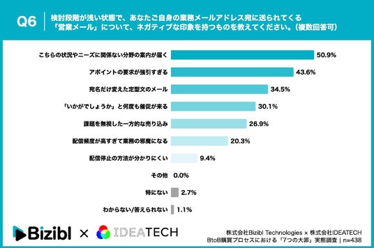 検討初期に届く営業メールについて、ネガティブな印象を持つ要因(複数回答)は以下の通りです。