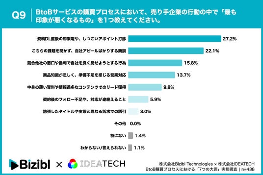 ウェビナーマーケティングSaaS「Bizibl(ビジブル)」を提供する株式会社Bizibl Technologies(本社:東京都千代田区、代表取締役CEO:花谷燿平、以下 Bizibl)は、株式会社IDEATECH(本社:東京都港区、代表取締役社長:石川友夫)と共同で、直近1年以内にBtoBサービスの導入検討・選定に関わった購買担当者438名を対象に、BtoB購買プロセスにおける「嫌われる営業」の実態調査を実施しましたので、お知らせいたします 。