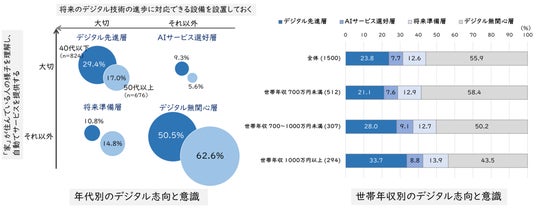 世帯年代別と収入別に四分類とし、下図に示します(2025年調査)。40代以下では、“「家」が自動でサービスを提供する”、“将来技術に対応できる設備を設置しておく”ことを大切と考える「デジタル先進層」が29.4%と50代に比べて12.4ポイント多く、また世帯年収が高い人ほど多い傾向もみられました。