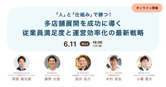 施設特化型モバイルオーダーシステムをはじめ商業施設DXの伴走支援を手がけるスカイファーム株式会社(本社:神奈川県横浜市 代表取締役:木村 拓也)は、5社共催となる無料オンラインセミナー『「人」と「仕組み」で勝つ!多店舗展開を成功に導く従業員満足度と運営効率化の最新戦略』に登壇いたします。
