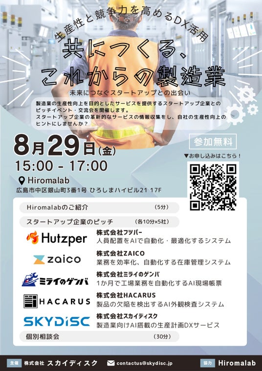 株式会社スカイディスク(本社:福岡県福岡市中央区、代表取締役CEO:内村 安里、以下「スカイディスク」)は、ピッチイベント「共につくる、これからの製造業 ―未来につなぐスタートアップとの出会い―」を主催・登壇します