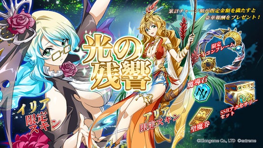 『光の残響コレクション』は累計チャージ額が指定金額に達すると、そのチャージ額に応じた報酬を獲得できる期間限定イベントです。SSR英雄:イリアとアリアの限定スキンのほか、兵士スキン、限定アイコンフレームや聖魔券、魔導石など、豪華報酬を獲得することができます。