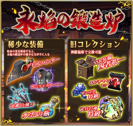 「永焔の鍛造炉」では、毎日のデイリー任務や挑戦任務をクリアすることで鍛造経験値を獲得し、鍛造炉のレベルが上がります。鍛造レベルが上がると、SSR装備など様々なアイテムが手に入ります。鍛造レベルが上限に達すると、経験値は「神炎の槌」に変換され、