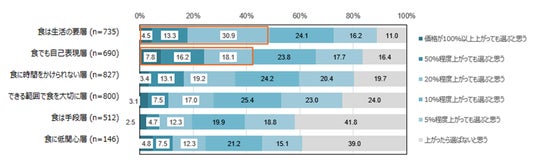 社会課題に配慮した食に対して、「食は生活の要層」「食でも自己表現層」では、値上げを許容できる範囲が、他のセグメントと比べて全体的に高い傾向にあります。加えて、この2セグメントでは、値上げ許容範囲が「20%程度以上」と回答した割合が4割を超えました。
