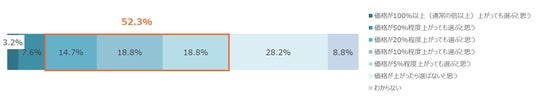一方、価格許容度では特徴的な結果が見られました。気候変動適応に対応した食への置換意向のある回答者(39.5%/図表4)においては、価格が上昇しても選ぶと回答した割合が70%を超え、さらに「20%程度」以上の価格上昇でも選ぶと回答した割合も30%を超えるなど、他の社会課題よりも高い水準となっています(図表5)。