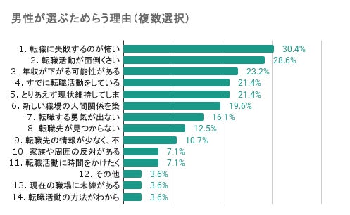 転職をためらう理由としてもっとも多かったのは「とりあえず現状維持してしまう」で33.7%、次いで「転職活動が面倒くさい」が27.5%、3位は「転職に失敗するのが怖い」が27.0%となりました。4位は「新しい職場の人間関係を築くのが不安」で25.3%、5位は「転職する勇気が出ない」で21.3%と続きます。
