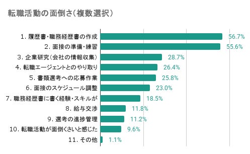 転職活動のどの部分が面倒だと感じるかについて、もっとも多かったのは「履歴書・職務経歴書の作成」で56.7%、次いで「面接の準備・練習」が55.6%となりました。3位は「企業研究(会社の情報収集)」で28.7%、4位は「転職エージェントとのやり取り」で26.4%、5位は「書類選考への応募作業」で25.8%と続きます。