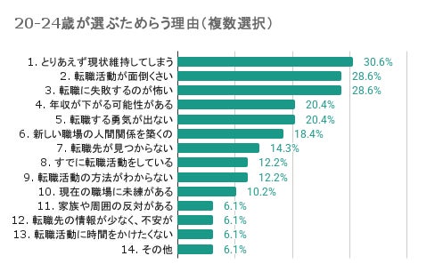 一方、20代の女性の方が「とりあえず現状維持してしまう」(39.7%)、「新しい職場の人間関係を築くのが不安」(28.1%)を選ぶ割合が高く、女性特有の不安が浮かび上がりました。