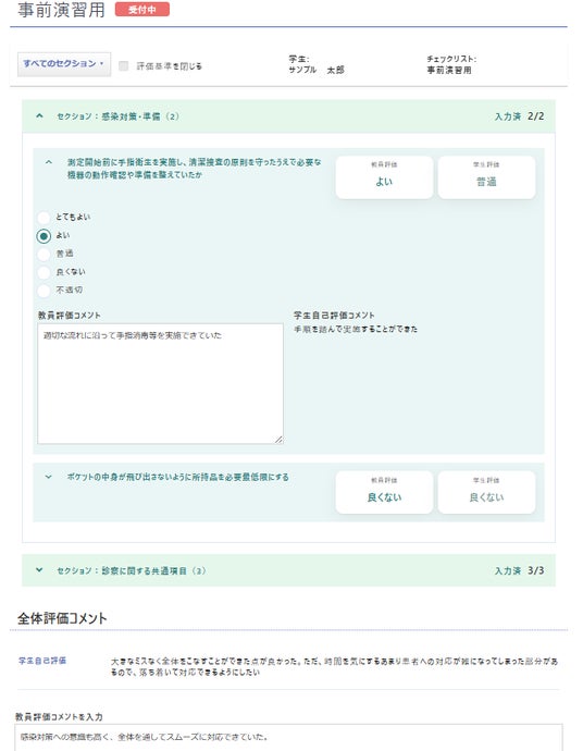 教員画面では、試験で使用するチェックリストを作成することができます。評価基準やチェック項目を自由に設定できるため、OSCEはもちろん、幅広いシーンでご活用いただけます。試験実施後は、学生一人に対して複数の教員がシステム上で同時に評価を行えるため、情報共有や評価決定の手間を低減することができます。