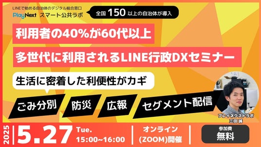 プレイネクストラボ株式会社(本社:東京都品川区、代表取締役:柏 匠、以下 プレイネクストラボ)は提供中の行政DXサービス「スマート公共ラボ」の最新事例セミナーを無料で5月27日(火)15時より開催します。