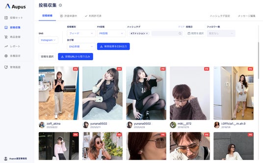 Aupus(オーパス)は、SNS上に存在するUGCやPR投稿を収集・分析・管理し、サイト活用と市場分析を同時に実現するマーケティングツールです。