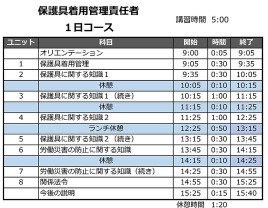 令和6年4月以降に保護具着用管理責任者に選任される予定の方対象に、必要な知識と実務能力を習得していただくため、学科5時間のカリキュラムによる講習です。