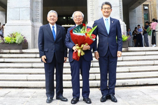河野知事、外山県議会議長をはじめ大勢の県民や職員が迎えるなか、伊藤一彦氏が宮崎県庁に来庁しました。宮崎県庁本館講堂において授賞式が開催され、河野知事が「宮崎県県民栄誉賞」を贈呈しました。