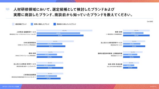 「Q3. 人材研修領域において、選定候補として検討したブランドおよび実際に商談したブランド、商談前から知っていたブランドを教えてください。」(n=200)と質問したところ、選定候補ブランドは「株式会社リクルートマネジメントソリューションズ」が63.0%、実際に商談したブランドは「株式会社リクルートマネジメントソリューションズ」が49.5%、商談前から知っていたブランドは「株式会社リクルートマネジメントソリューションズ」が53.5%という回答となりました。