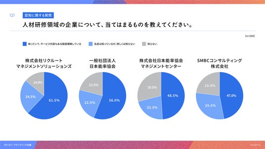 「Q1. 人材研修領域の企業について、当てはまるものを教えてください。」(n=200)と質問したところ、「知っていて、サービス内容もある程度理解している」と回答した割合は、株式会社リクルートマネジメントソリューションズは61.5%、一般社団法人 日本能率協会が56.0%、株式会社日本能率協会マネジメントセンターが48.5%となりました。