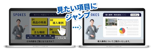 視聴者が見たいページをクリックして視聴できる「視聴者参加型のインタラクティブ動画」を作成できます。一方的に動画を見るのではなく、視聴者自らが知りたい情報を選択することが可能です。