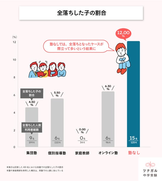 ・「塾なし受験」では、全落ちした子どもの割合が12.0%と、他の学習スタイルと比較して最も高い結果となった。
