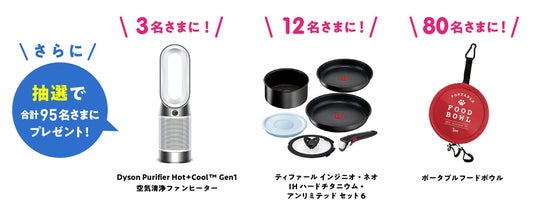 本キャンペーンは、期間中にペット保険にお申込みいただいたご成約者さま全員に、「ミスタードーナツ ギフトチケット(300円)」をプレゼントします。さらに抽選で合計95名さまに、1台3役の空気清浄ファンヒーターや人気の調理器具、持ち運びに便利で防災グッズにもなるポータブルフードボウルが当たります。