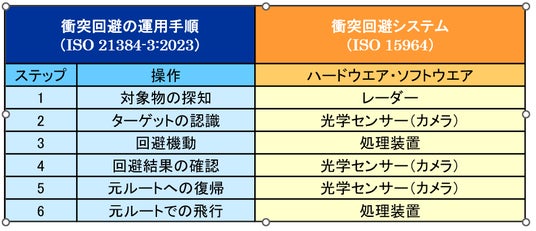 この成果をもとにした日本発の提案により、2023年10月、無人航空機の運航手順の規格である「ISO 21384-3:2023 Unmanned aircraft systems Part 3:Operational procedures※3」(以下、ISO 21384-3:2023)に衝突回避CONOPS (Concept of Operations:運用構想)が新たな章として追加され、6ステップからなる基本的な衝突回避手順が規定されました。さらに、2024年4月15日には、技術報告書ISO/TR 23267※4が公開されています。