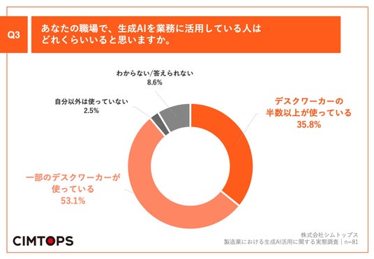 Q1で「社内ルールが整備されており、使用可能な環境が整っている」「社内ルールは未整備だが、使用可能である(使っている人もいる)」と回答した方に、「Q3.あなたの職場で、生成AIを業務に活用している人はどれくらいいると思いますか。」(n=81)と質問したところ、「デスクワーカーの半数以上が使っている」が35.8%、「一部のデスクワーカーが使っている」が53.1%という回答となりました。