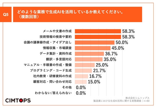 Q2で「はい」と回答した方に、「Q5.どのような業務で生成AIを活用しているか教えてください。(複数回答)」(n=60)と質問したところ、「メールや文書の作成」が58.3%、「技術情報の検索や要約」が58.3%、「会議の議事録作成・アイデア出し」が50.0%という回答となりました。