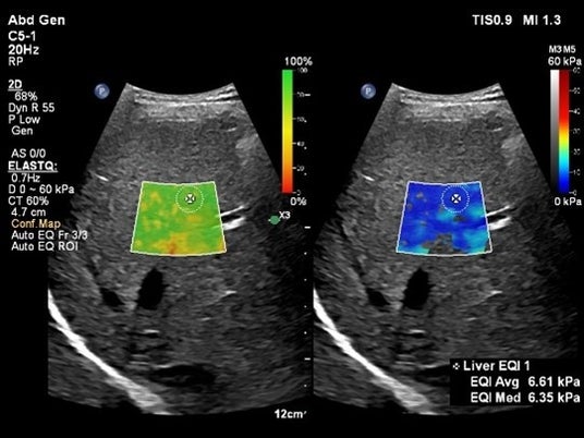 Shear Wave Elastographyを用いて肝臓の硬さを非侵襲的に計測するアプリケーションElastQ(エラストキュー)に、自動化機能が追加されました。Auto ElastQは、計測に適したフレームやROIポジションを自動で判別し、計測結果を表示することが可能です。これにより、これまで課題であった検査時間を最大60%短縮し[2]、99%の再現性が報告されています。[3]