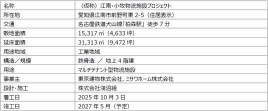 東京建物株式会社(代表取締役 社長執行役員 小澤克人/以下、東京建物)とミサワホーム株式会社(代表取締役社長執行役員 作尾徹也/以下、ミサワホーム)は、2025年10月3日に、愛知県江南市においてマルチテナント型物流施設「(仮称)江南・小牧物流施設プロジェクト」(以下、本施設)の建設工事を着工しました。本施設は、ミサワホーム所有地を活用し建設するもので、建物はミサワホームと東京建物が共同で所有し、竣工は2027年5月を予定しています。なお、本施設の開発はミサワホームの自社保有不動産を活用したCRE※2事業によるものであり、同事業によるマルチテナント型物流施設の開発はミサワホームとして初となります。また、本施設では、再生可能エネルギーの活用と省エネルギー化を推進し、環境配慮型物流施設としてZEBの認証を取得する計画です。