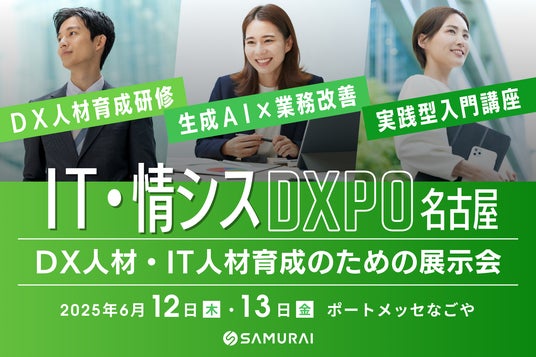 プログラミングスクール「SAMURAI ENGINEER(侍エンジニア)」を運営する株式会社SAMURAIは、2025年6月12日(木)、13日(金)にポートメッセなごやで開催される、IT人材の育成・採用を支援するソリューションが集う専門展『IT・情シスDXPO 名古屋'25』に出展いたします。