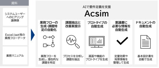 Acsimは、企業ごとの業務やビジネスに関する知識、判断基準をAIに学習させることで、自社に特化した要件定義環境を提供します。さらに、AIを活用しプロセスを標準化・効率化し、属人的な作業を軽減することで、経験に依存しない円滑な要件定義を実現します。要件定義に必要な業務フローの作成・分析から、アプリケーション画面のプロトタイプ作成、基本設計書、稟議書などのドキュメント作成までトータルで支援します。主な機能は以下の通りです。