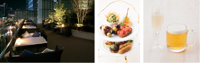 「ルーフトップビアガーデン」では、通常のディナーメニューであるニューヨークの最新トレンドを盛り込んだビストロメニューに加え、サラベスで大人気の一口サイズのオードヴルを盛り合わせで楽しめる二段プレート「サラベス特製オードヴルタワー」(1,200円・税込/上写真中央)を販売するほか、ハートランド生ビールとグラススパークリングワインを特別価格(各500円・税込、通常価格700円)で提供します。