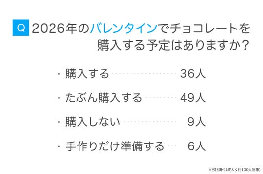 2026年のバレンタインでチョコレートを購入する予定があるかを成人女性100人に尋ねたところ、「購入する」「たぶん購入する」と回答した人が合わせて85人となり、全体の8割以上を占めました。