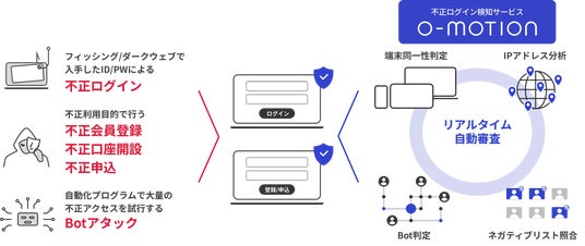 Caccoが提供する不正ログイン検知サービス「O-MOTION」は、ログイン/申込画面における不正ログイン、不正会員登録・口座開設、Bot攻撃などを検知・モニタリングするクラウド型サービスです。