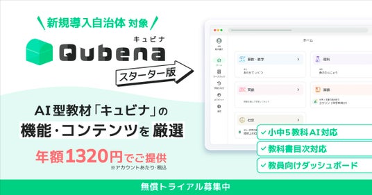学習eポータル+AI型教材「キュビナ」を開発・提供する株式会社COMPASS(本社:東京都文京区、代表取締役:佐藤 潤、以下 COMPASS)はこのたび、新規導入自治体向けにキュビナの機能・コンテンツを厳選した、学習eポータル+AI型教材「キュビナ スターター版」をリリースすることをご報告いたします。本サービスでは、キュビナのAIによる個別最適な学びを年額1,320円(税込み、アカウントあたり)でご利用いただけます。あわせて、本サービスを無償でお試しいただけるトライアルの募集を開始いたします。