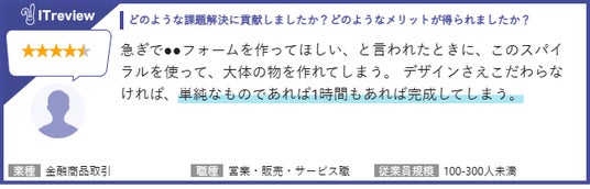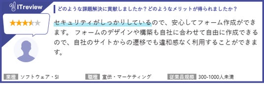 このたび頂戴したユーザーコメントでは、「セキュリティがしっかりしているので、安心してフォーム作成ができます」、「簡単に入力ページから確認ページ、送信ページまで作成でき効率が良い」、「単純なものであれば1時間もあれば完成してしまう」など、セキュリティ面での信頼性、入力から送信までをスムーズに構築できる操作性、短時間で仕上げられるスピード感の三点において高いご評価をいただきました。