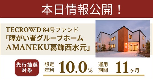 この度、新たにTECROWD84号ファンド「障がい者グループホーム AMANEKU葛飾西水元」を2025年7月24日(木)に情報を公開し、先行抽選受付を開始します。また、本ファンドは2025年8月5日(火)18時より先着順にて募集を開始いたします。