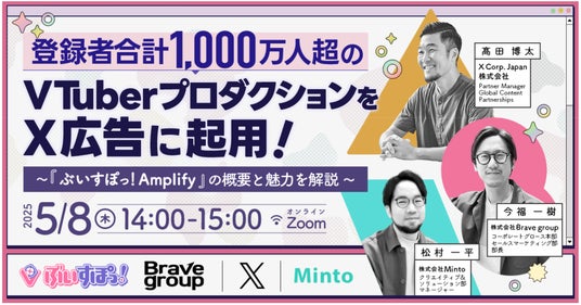 株式会社Minto(東京都港区、代表取締役社長 水野和寛、以下当社)は、次世代 Virtual esports Project「ぶいすぽっ!」運営の親会社である株式会社Brave group(本社:東京都港区、代表取締役:野口圭登、読み:ブレイブグループ、以下「Brave group」)と事業連携を行い、かつX Corp. Japan 株式会社とのパートナーシップを用いて、3社共同で「Amplifyスポンサーシップ」パッケージ(※)の『ぶいすぽっ! X Amplify Sponsorship』の提供を開始いたしました。