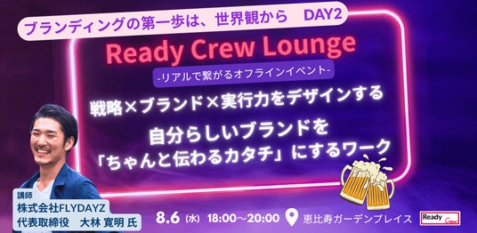 ビジネスマッチングコミュニティ「Ready Crew(レディクル)」を運営する、フロンティア株式会社(本社:東京都渋谷区、代表取締役社長:高橋 政裕)は、広報・マーケティング・企画・新規事業担当者を対象とした実践型イベント「『ブランディングの第一歩は、世界観から』DAY2 戦略×ブランド×実行力をデザインする~自分らしいブランドを「ちゃんと伝わるカタチ」にするワーク~」を、2025年8月6日(水)に恵比寿の本社にて開催いたします。