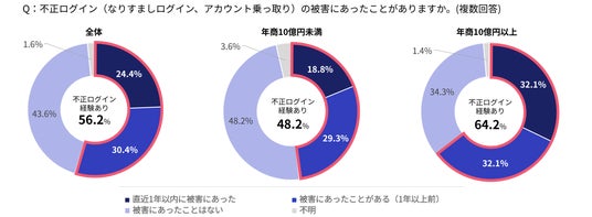不正ログイン被害の経験率は2024年の54.8%から2025年は56.2%へと2ポイント増加。年商10億円以上の事業者では64.2%が被害を経験しており、企業規模が大きいほど被害が発生しやすい傾向がみられた。