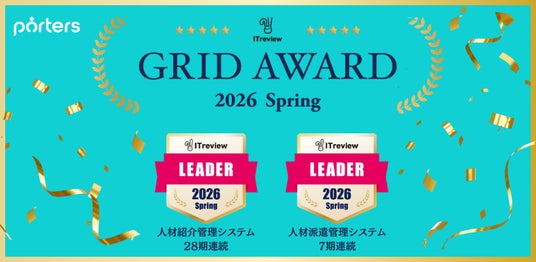 人材ビジネス向けマッチングシステムを提供するポーターズ株式会社(東京都港区、代表 西森 康二)は、「ITreview Grid Award 2026 Spring」(主催:アイティクラウド株式会社)において、人材紹介管理システム部門・人材派遣管理システムの2部門で最高位「Leader」賞を受賞いたしました。
