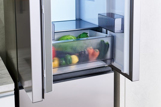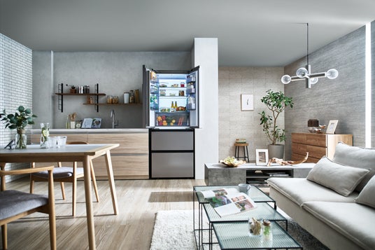 冷蔵室にシンメトリーのフレンチドアを採用した4ドアのCŌRISMには、温かみがあり落ち着いた印象のアイボリーカラーを採用しました。クラス最薄※1奥行59.4cmの薄型デザインは、一般的なシステムキッチンとラインが揃いやすく、キッチンにスッキリとなじむ設置が可能です。冷蔵室の扉は90°開くとバスケットが引き出せる「壁際フィット構造」になっています。