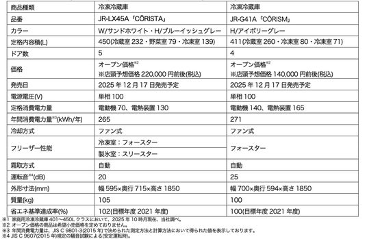 450L冷凍冷蔵庫JR-LX45A「CŌRISTA」・411L冷凍冷蔵庫JR-G41A「CŌRISM」の概要は以下の通りです。