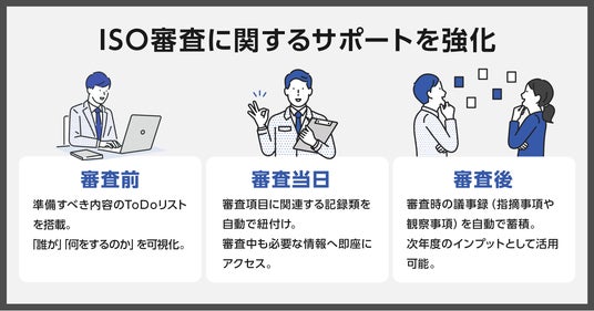 Pマーク、 ISOコンサルにおける支援実績 No.1(注1)のISO/Pマークの取得・運用支援サービス「認証パートナー」を提供する株式会社スリーエーコンサルティング(本社:大阪府大阪市、代表取締役社長:竹嶋 寛人)は、このたび、当社が提供するクラウド型ISO管理ツール『9001アシスト』『14001アシスト』『ISMSアシスト』において、「審査準備」機能の拡充およびアップデートを実施いたしました。今回のアップデートにより、ISOの審査に向けて実施すべき項目が一目で把握できるようになり、対応漏れや手戻りの防止に貢献します。また、ToDoリストによる準備状況の可視化を通じて、審査前に感じやすい不安や負担の軽減も図ることができます。
