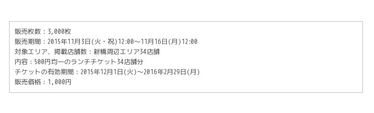 株式会社リクルートライフスタイル(本社:東京都千代田区、代表取締役社長:淺野 健) が運営する割引チケット購入サイト『ポンパレ』は、対象店舗の対象商品を500円均一で食べることができる「ポンパレランチチケット」の試験販売を開始いたしますので、下記の通りお知らせいたします。まずは新橋周辺エリアの34店舗で使えるチケットを、 2015年11月3日(火・祝)より3,000枚限定で販売いたします。