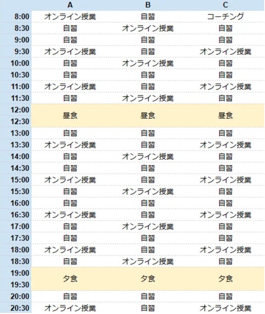 スケジュール例は以下画像のようになっており、A・B・Cの日程をそれぞれ3日程ずつ組み合わせます。