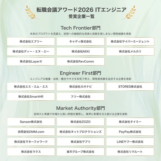 株式会社リブセンス(代表取締役社長:村上太一、本社:東京都港区、証券コード:6054)が運営する転職口コミサイト『転職会議』(URL:https://jobtalk.jp/) は、「転職者の個々の価値観とその変化に寄り添った仕事選びを実現する」、「各企業の文化を尊重しながら、より"良い会社"を増やしていく」という2点をサービスビジョンとして掲げており、具現化する取り組みとして、幅広い業界・職種に向けた『転職会議アワード』(URL:https://jobtalk.jp/lp/select/001)の開催を発表しました。初回となる今回は「ITエンジニア」を積極採用している国内企業から受賞企業25社を選出しました。