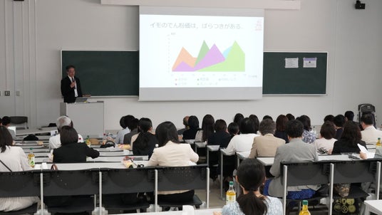 講演会には、大学関係者など約80名の方々が参加。様々ないも類の種類や、その成分、活用方法などをクイズ形式で触れながら当社の主要原材料のひとつであるじゃがいもの貯蔵特性や国内品種の現状、調達についてお話ししました。
