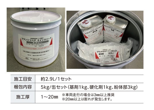 このたび加わった「プラントリペア クイックハード」は、簡易補修材でありながら、コンクリート表面の剥離、欠損、ひび割れといった損傷に、わずか1時間で実用硬度まで硬化する「スピードと強度」を重視した現場主義の商品です。約3時間後には重量物やAGVの走行にも耐え、当社が取り扱う補修材の中では最高グレードの耐久性をほこります。
