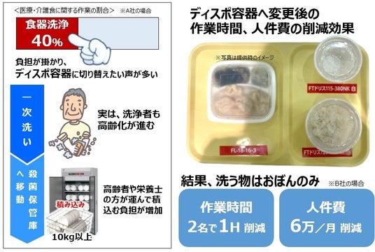 「FTドリスNK」および「FT温デリNK」シリーズは、「使い捨て」を意味する「ディスポーザブル」の略称である「ディスポ」の概念を医療・介護給食に応用し、現場の作業負担を大幅に軽減し、衛生面を強化する画期的な製品です。